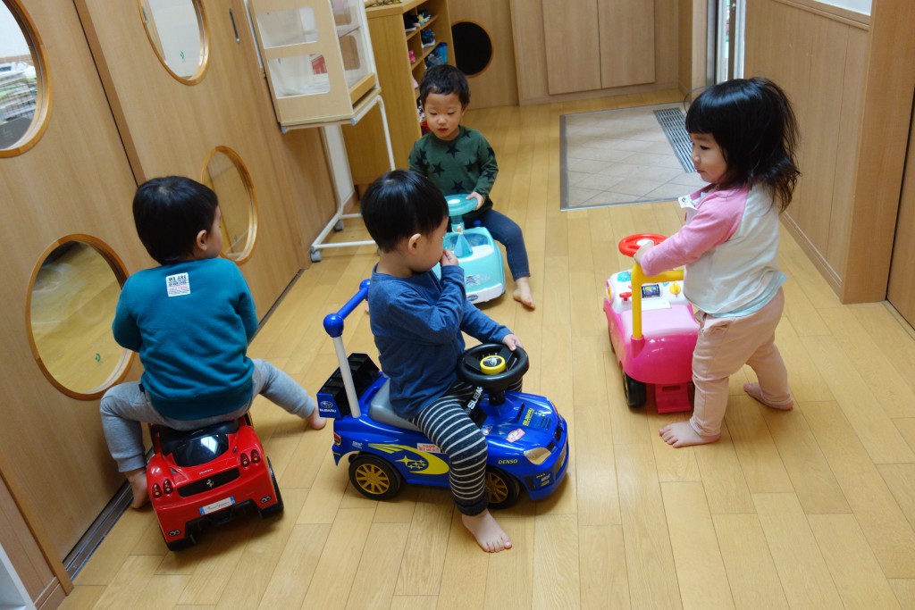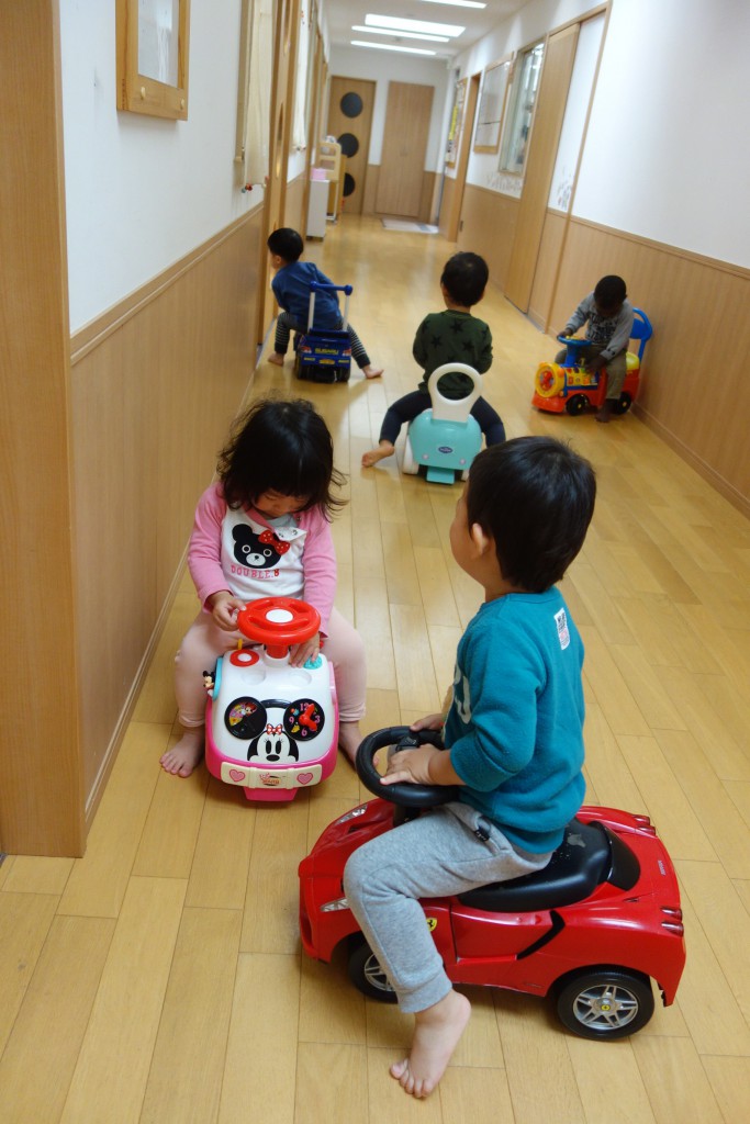 雨天時は、廊下で大好きなコンビカーに乗って、ドライブや手押しで進むのを楽しんでいます。