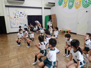 ホールにつばめぐみ、ひばりぐみが集まり、1グループ7~8人の6グループが揃いました。グループで話し合ったことを発表してもらう形式で話が進んでいきましたが、1回目では手探りな様子ながらも、意見を言ったり友だちの意見を聞いてみたりする姿が見られました。