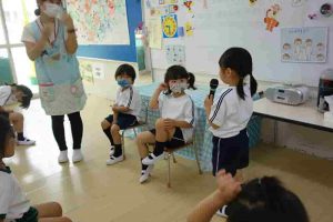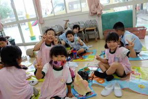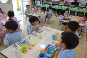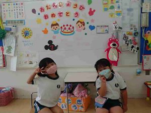 幼児部*7月生まれ誕生会 2020年7月29日 7月生まれの誕生会がありました。各クラスでお誕生日のお祝いをしました。 クラスのみんなの前に立つと少し緊張した様子でしたが、「おめでとう」とお祝いされると照れながらも嬉しそうにしていました。 またお皿や絵本のプレゼントをもらい、大事そうに抱えていました。 お誕生会の後は、先生の出し物を見て楽しんだり、皆でゲームをしたり… 愛情いっぱいの手作り弁当もおいしくいただきました!!