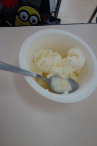 エプロンと三角巾を身に着け準備万端!材料を聞いて「ケーキかな?」「プリンかも!」と予想していましたが、「アイスを作ります!」と伝えると「やったー!」ととても喜んでいました。