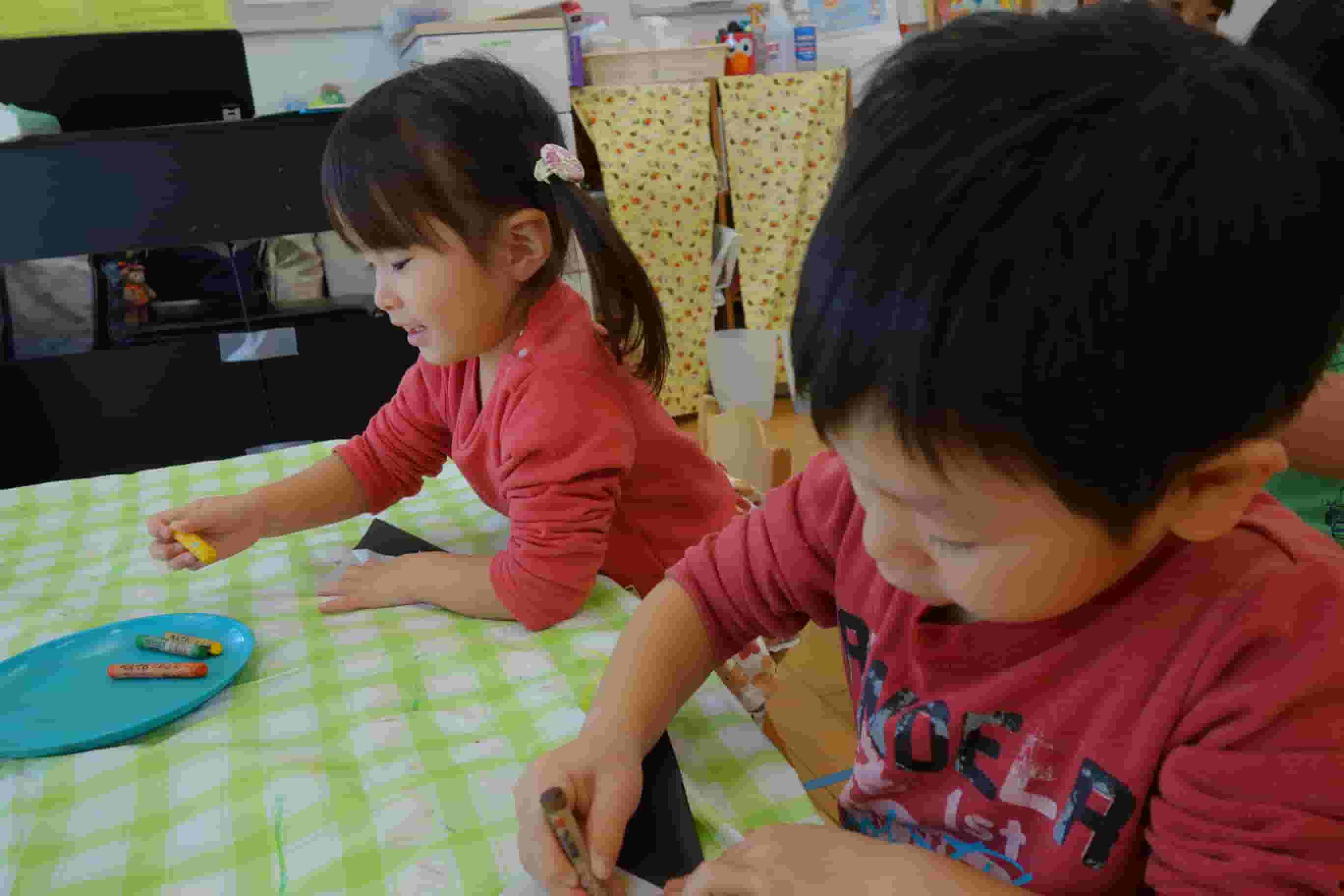 先生のお話をよく聞く、さくら組のお友だち。紙を折って、折り目をアイロンして、クレヨンで自分の好きなおにぎりの具をグリグリ!