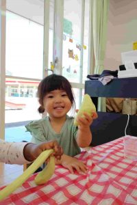 アイスなど色々なものを作ったり、びよーんと伸ばしたりと色々な遊びを見つける子どもたちです。