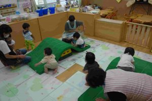 月齢の低い子は、お布団山のクッションの上に、先生に乗せてもらって周りを見渡したり、お山の感触を楽しみました。