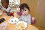 ご飯を作ると、「あーん」と言いながら先生たちやお友だち、赤ちゃんの人形に食べさせてあげるのがブームです ೀ⋆⑅˚