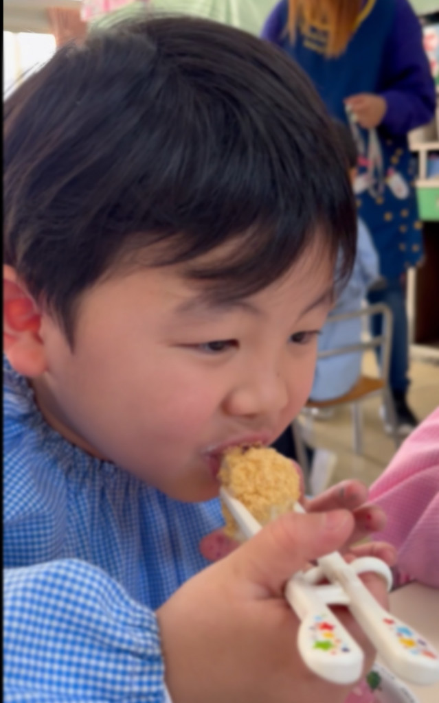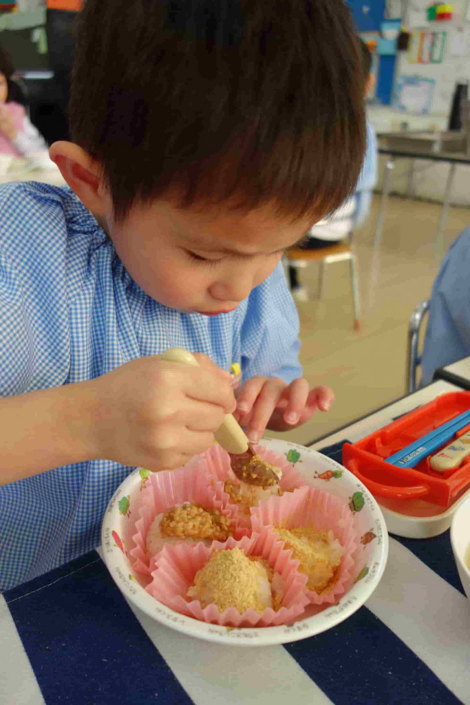 もちつき体験を終えた後はお楽しみの給食!おこわに納豆やきな粉をかけて食べました♪
