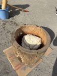 重い杵を持ちながらも一生懸命におもちをつくお友だち!