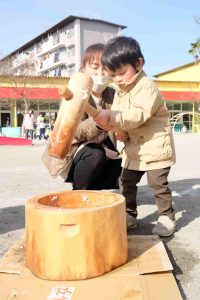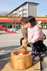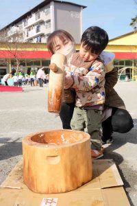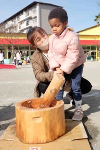 本番も本物の杵を先生と一緒に持ち、おもちを上手につくことができました✨