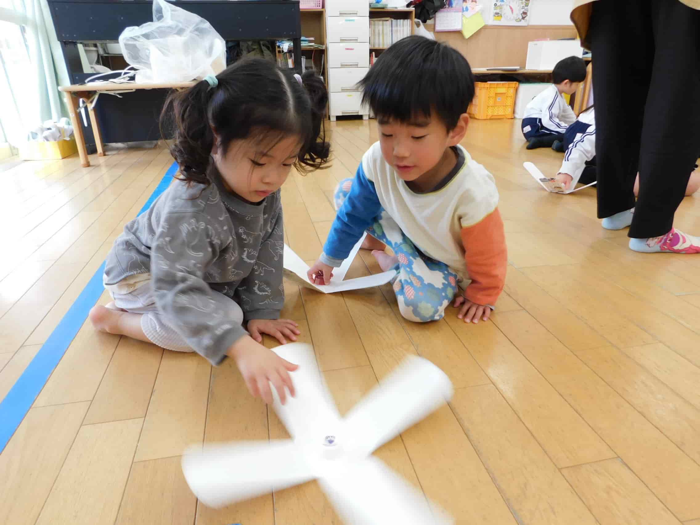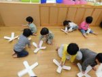 コマ回しでは、にじ・そら組のお友だちと一緒にコマ回し大会を開きました★グループに分かれそれぞれのチャンピオン同士が対決!「がんばれー!」とみんなからの応援の声が飛び交い、大盛り上がりでした