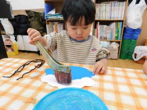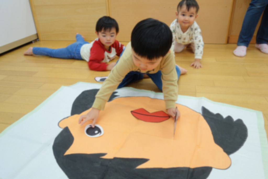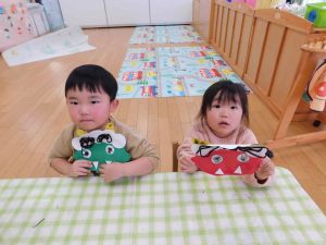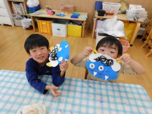 製作では節分に向けて鬼面を作りました!鬼の色を自分で決め、毛糸を貼って髪の毛を作ったり、目や口を自分で描いてかわいい、かっこいい鬼が完成しました✨