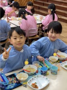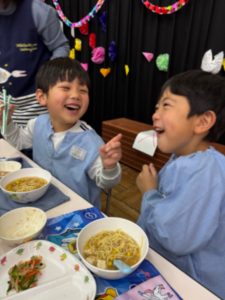 そして年長さんは、ホールで給食を食べました。トッピングを自分で選び、オリジナルラーメンを楽しく、美味しくいただきました。