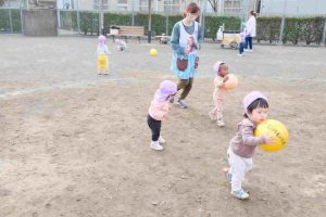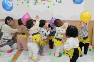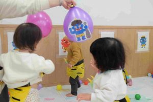壁や風船に貼られて鬼たちに向かって、カラーボールで豆まきをしました!上手にボールを投げたり、直接アタックしたり楽しんで鬼退治をしていましたよ😉💕