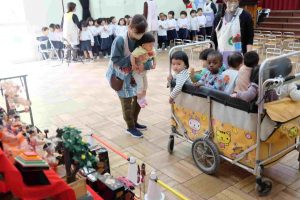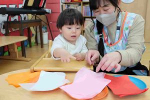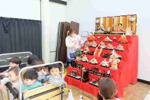 カラフルなお花紙から好きな色の選び、両手を使ってクシャっと丸め、透明の袋の中へ・・・。おひなさまとおだいりさまの着物を製作しましたよ!カラフルで可愛いおひなさまが完成しました😍おひな様製作の後は、ホールに行き、本物のおひなさまも見学しています😉✨