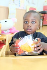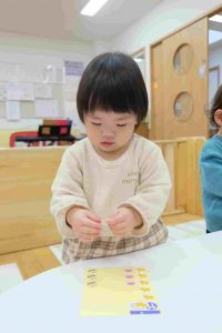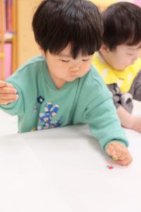 先生に手伝ったもらいながら、シールをはがし、模造紙にペたっ😉中には一人で剥がせるお友達も!模造紙だけでなく、次第にほっぺやおでこ、洋服までカラフルなシールだらけになったたんぽぽ組さんです💕