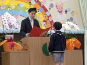 3月14日(土)に卒園式が行われました。いつもどおり元気に笑顔で登園した子どもたち。真剣な表情で式に臨み、園長先生から卒園証書を受け取りました。子どもたちのかっこいい姿や一生懸命歌う姿に成長を感じました。
