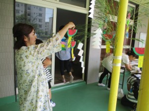 今日は、前回作ったスイカの短冊を笹の葉に飾りみんなで七夕の歌をうたい、帰りに少しですが短冊をつけた笹を持ち帰りました。