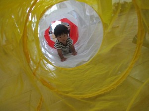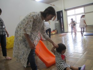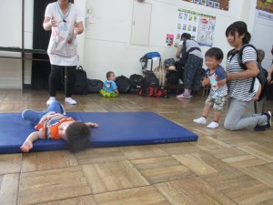 今日は体操をした後、サーキットを行いました。マットや平均台、トンネル、すべり台、トランポリンを出しチャレンジ!マットではゴロゴロと上手に転がることが出来ました。平均台では2,3歳のお友だちになると一人で落ちないように上手に歩くことができるお友だちもいました。すべり台やトランポリンは人気で「もっとやりたい」というお友だちもいましたが、きちんと順番を守って上手にできていました!