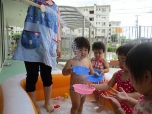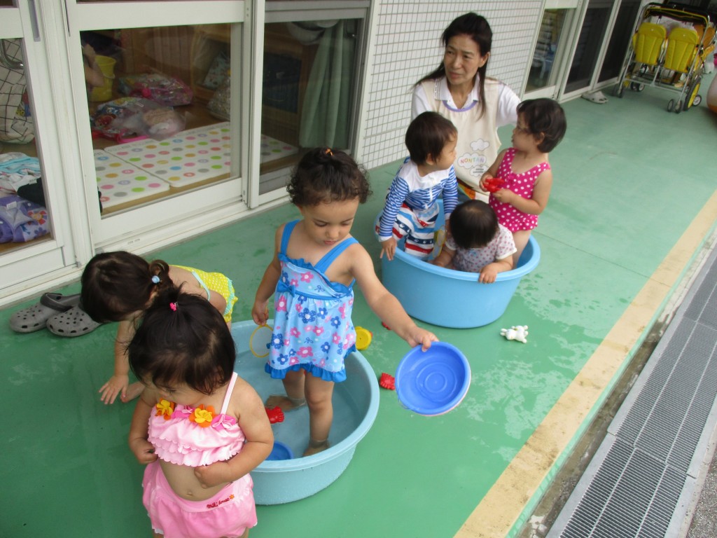 乳児部*水遊びの様子 2017年7月10日 七月に入り、夏の暑さも本格化してきたこの頃。乳児部でも水遊びが始まりました! ビニールプールに水を張る様子を、窓から興味津々に見つめていた子ども達。 始めはおそるおそる足を水に浸けてみて…といった様子でしたが、慣れるのもあっという間で、体ごとざぶんと中に入り手で水をかき混ぜてみたり、 ジョウロや容器で水をすくってみたり、大胆に水の感触と冷たさを楽しんでいました! まだまだ暑い日が続きますが、水遊びで涼をとりながら、楽しく元気に過ごしていきたいと思います。 たんぽぽ組 つばき組 さくら組