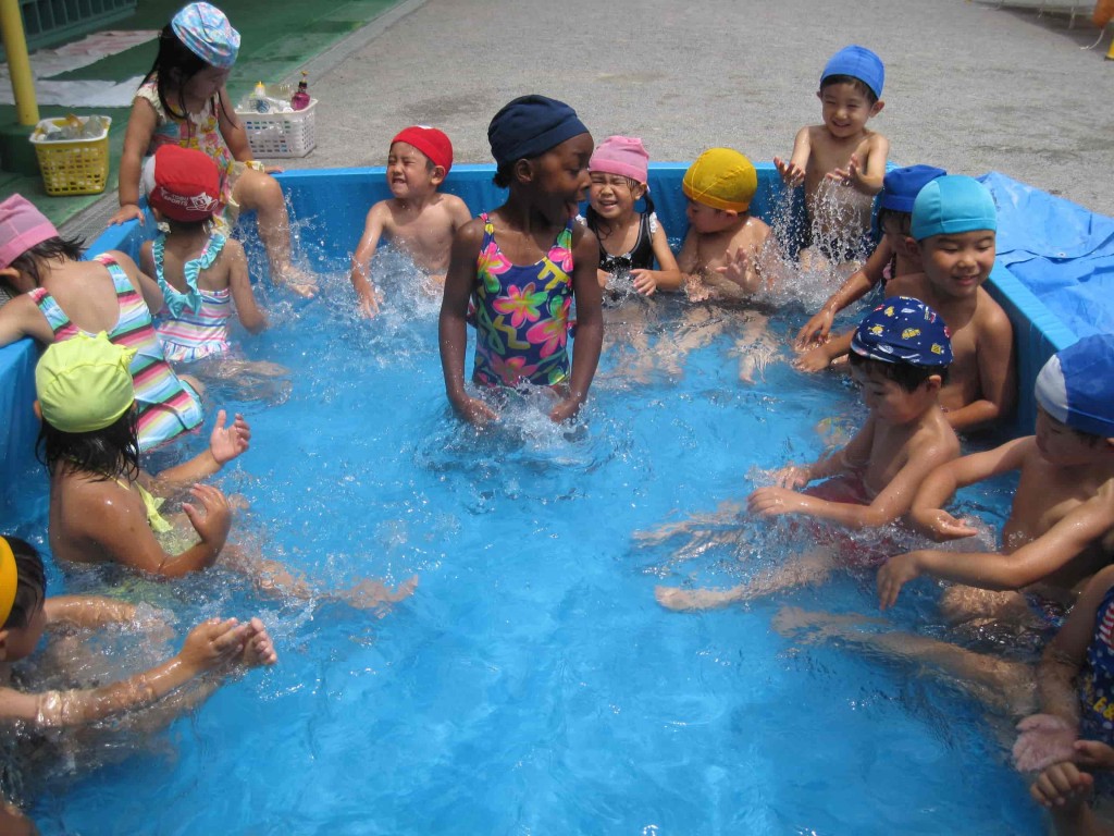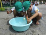 水遊びの様子(幼児部) 2017年7月12日 少しでも動くと汗をかく、そんな 真夏の猛暑のような 天気が続きます。 早くも夏バテ気味の大人(園長)をしり目に 子ども達は園庭で元気に水遊びを楽しんでいます♪ 今年は例年よりも雨の日が少なく、この季節ならではの遊びを 満喫しています。