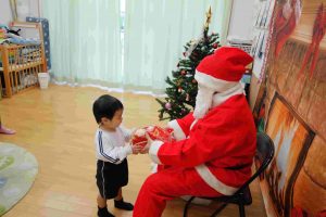そして、、、どこからともなく鈴の音が聞こえ、待ちに待ったサンタクロースの登場です!!真っ赤な服に身を包んだ白いおひげのおじいさんの姿に歓声を上げるお友だち、少し驚いて泣いてしまうお友だちなど、様々な反応が見られました。