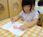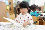 運動会で飾る国旗の塗り絵をしたり、にじ・そら組のお友だちと一緒に披露するぶどうダンスの練習をしています!